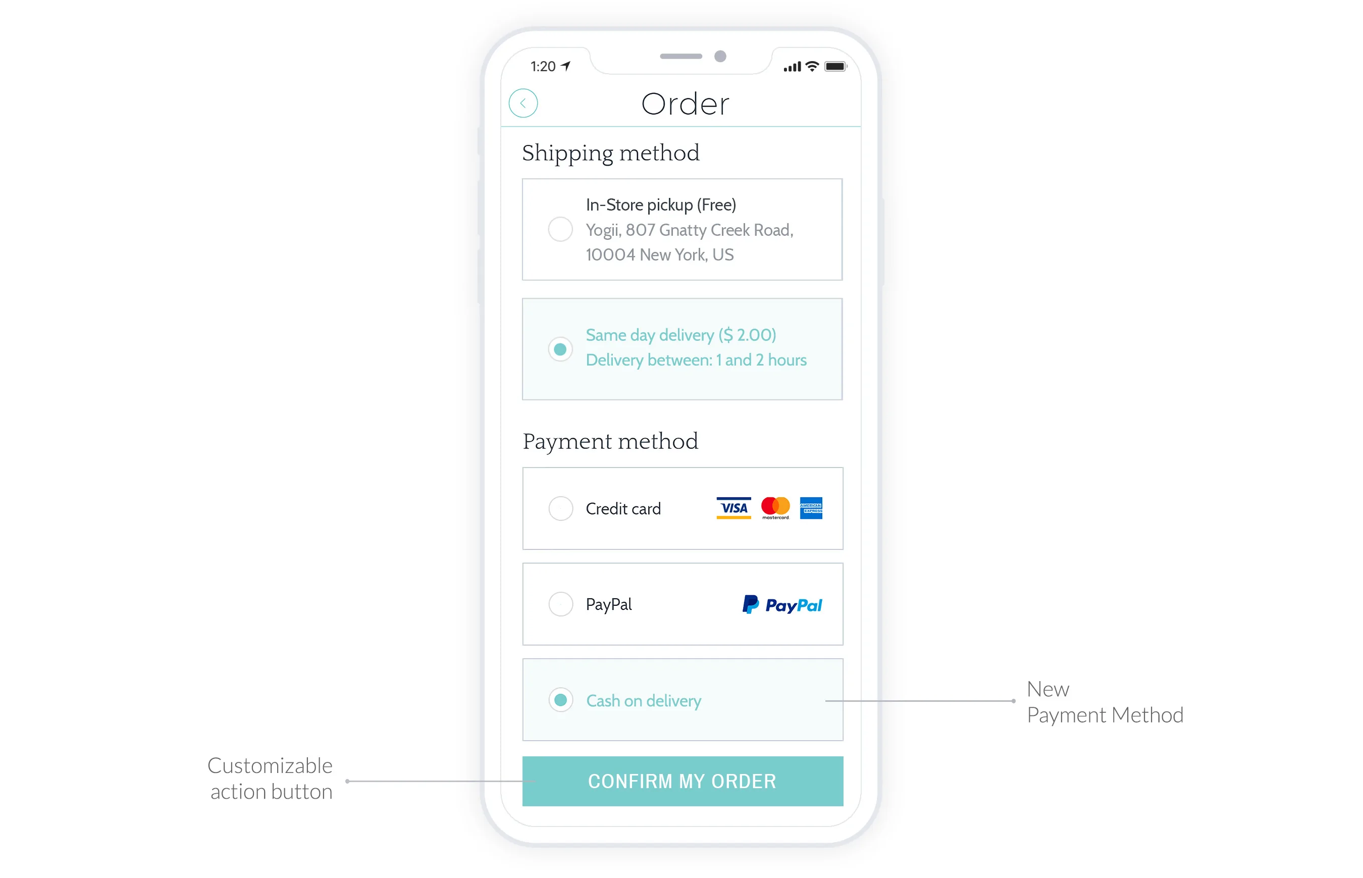 No todos se sienten cómodos dando su información de tarjeta de crédito en línea y, por lo tanto, podrían abstenerse de comprar productos desde tu aplicación. Facilita las compras para todos los clientes y llega a un público más amplio con pagos offline. No requieren tarjetas de crédito ni pasarelas de pago tradicionales. El proceso es fácil y transparente.