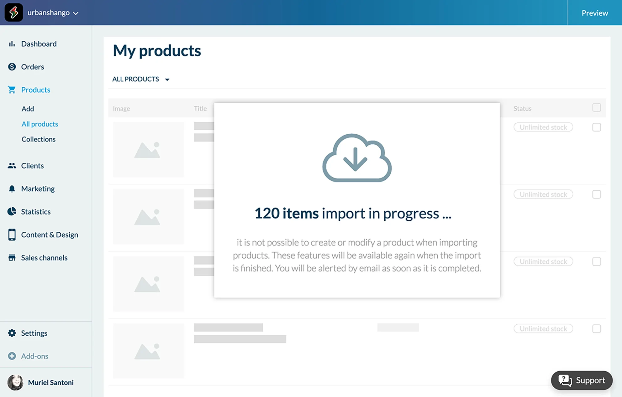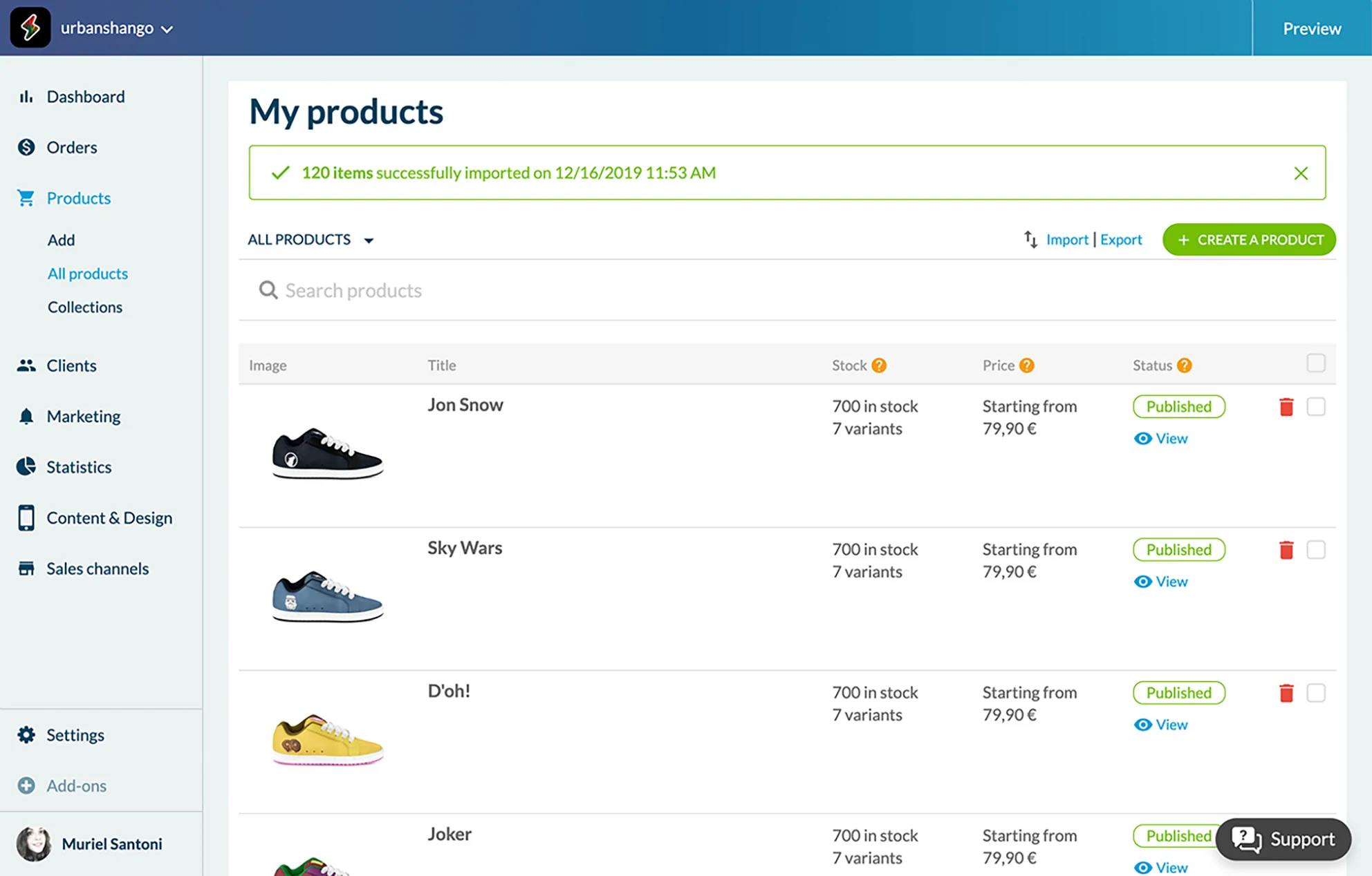 Crea tu catálogo en una sola acción. Incluye en tu archivo .csv todas las características de tus productos (SKU, variante, descripción, colección, SEO, URL, etc.)